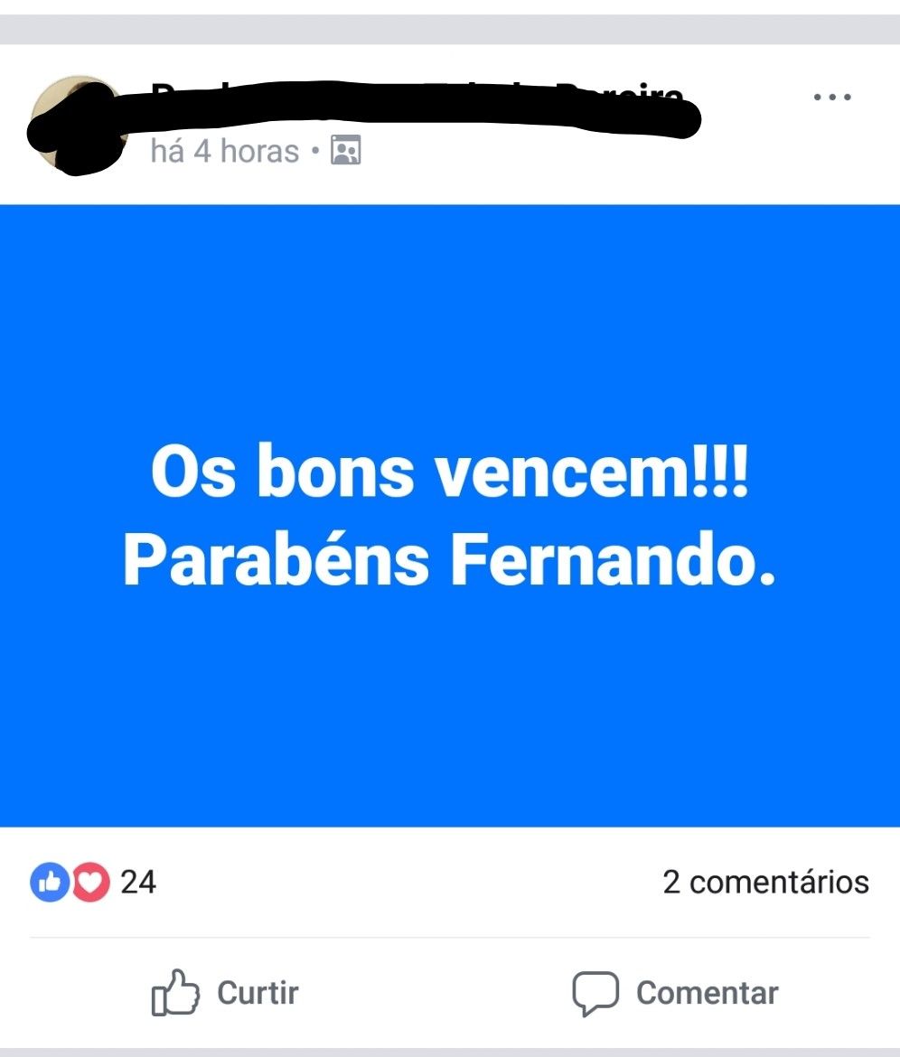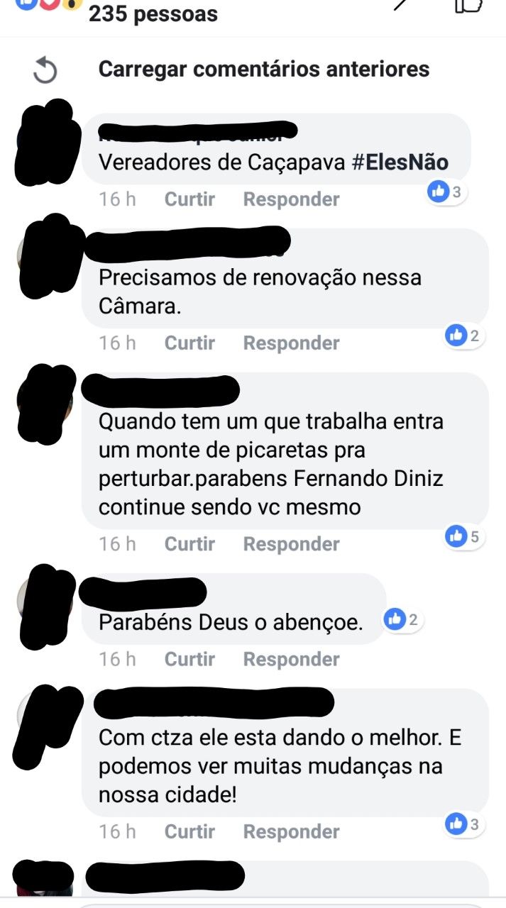 Reação - Nas redes sociais, inúmeras mensagens de apoio ao prefeito Fernando Diniz (PV) se espalharam . "Os bons vencem!!! Parabéns Fernando", disse um usuário. "Vereadores de Caçapava #ElesNão", disse outro usuário, fazendo alusão ao protesto que tomou conta das redes sociais contra o candidato à presidência, Jair Bolsonaro (PSL). "Quando tem um que trabalha entra um monte de picaretas pra perturbar. Parabéns Fernando Diniz continue sendo vc mesmo", escreveu outro usuário de uma rede social.
