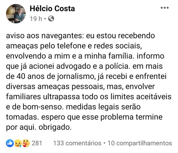O jornalista Hélcio Costa, ex-apresentador do programa Band Entrevista, denunciou nesta quinta-feira (13) que estaria recebendo ameaças por telefone e redes sociais. No post, feito em uma rede social, Costa disse: "Eu estou recebendo ameaças pelo telefone e redes sociais, envolvendo a mim e a minha família. Informo que já acionei advogado e a polícia", diz em parte do texto. Em outro trecho o jornalista continua. "Já recebi e enfrentei diversas ameaças pessoais, mas, envolver familiares ultrapassa todos os limites aceitáveis e de bom-senso".