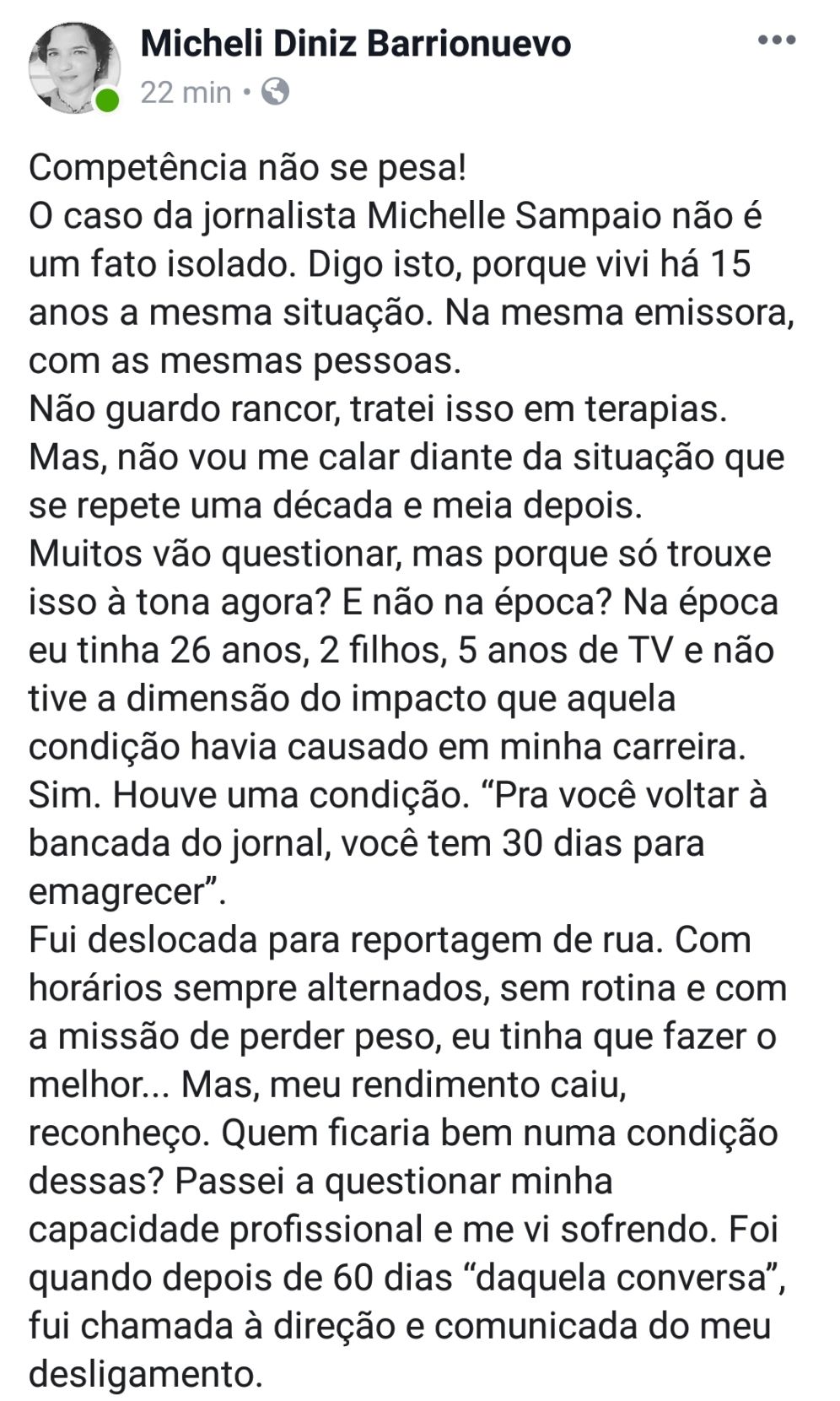 Micheli Diniz conta que houve um pedido com prazo que fosse cumprido como condição de permanecer ou não como funcionária da emissora. "Sim. Houve uma condição. 'Pra você voltar à bancada do jornal, você tem 30 dias para emagrecer'. Fui deslocada para reportagem de rua. Com horários sempre alternados, sem rotina e com a missão de perder peso, eu tinha que fazer o melhor. Mas, meu rendimento caiu, reconheço. Quem ficaria bem numa condição dessas? Passei a questionar minha capacidade profissional e me vi sofrendo. Foi quando depois de 60 dias 'daquela conversa', fui chamada à direção e comunicada do meu desligamento", relembra.