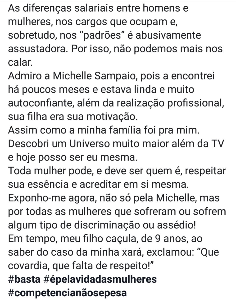 Usando as redes sociais, Micheli também fez um desabafo sobre o caso da colega Michelle Sampaio, uma vez que ela também passou pela mesma "pressão" quando estava a frente do vídeo. "O caso da jornalista Michelle Sampaio não é um fato isolado. Digo isto, porque vivi há 15 anos a mesma situação, na mesma emissora, com as mesmas pessoas. Não guardo rancor, tratei isso em terapias. Mas, não vou me calar diante da situação que se repete uma década e meia depois", disse a jornalista em seu perfil numa rede social.