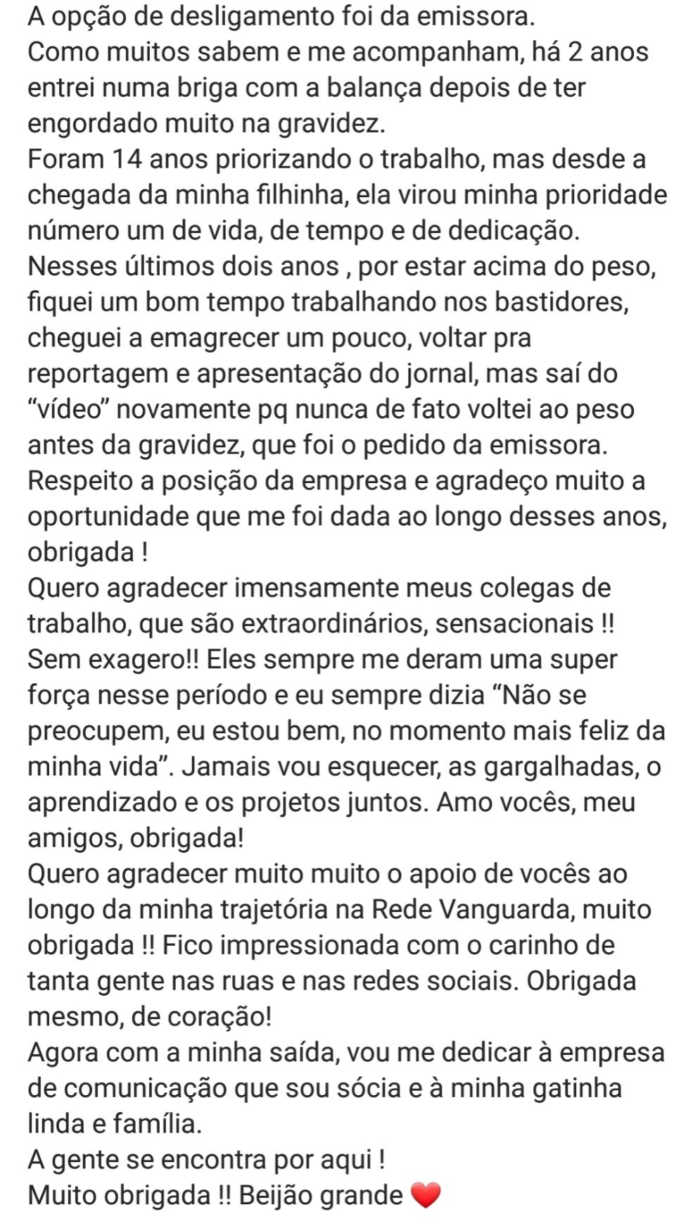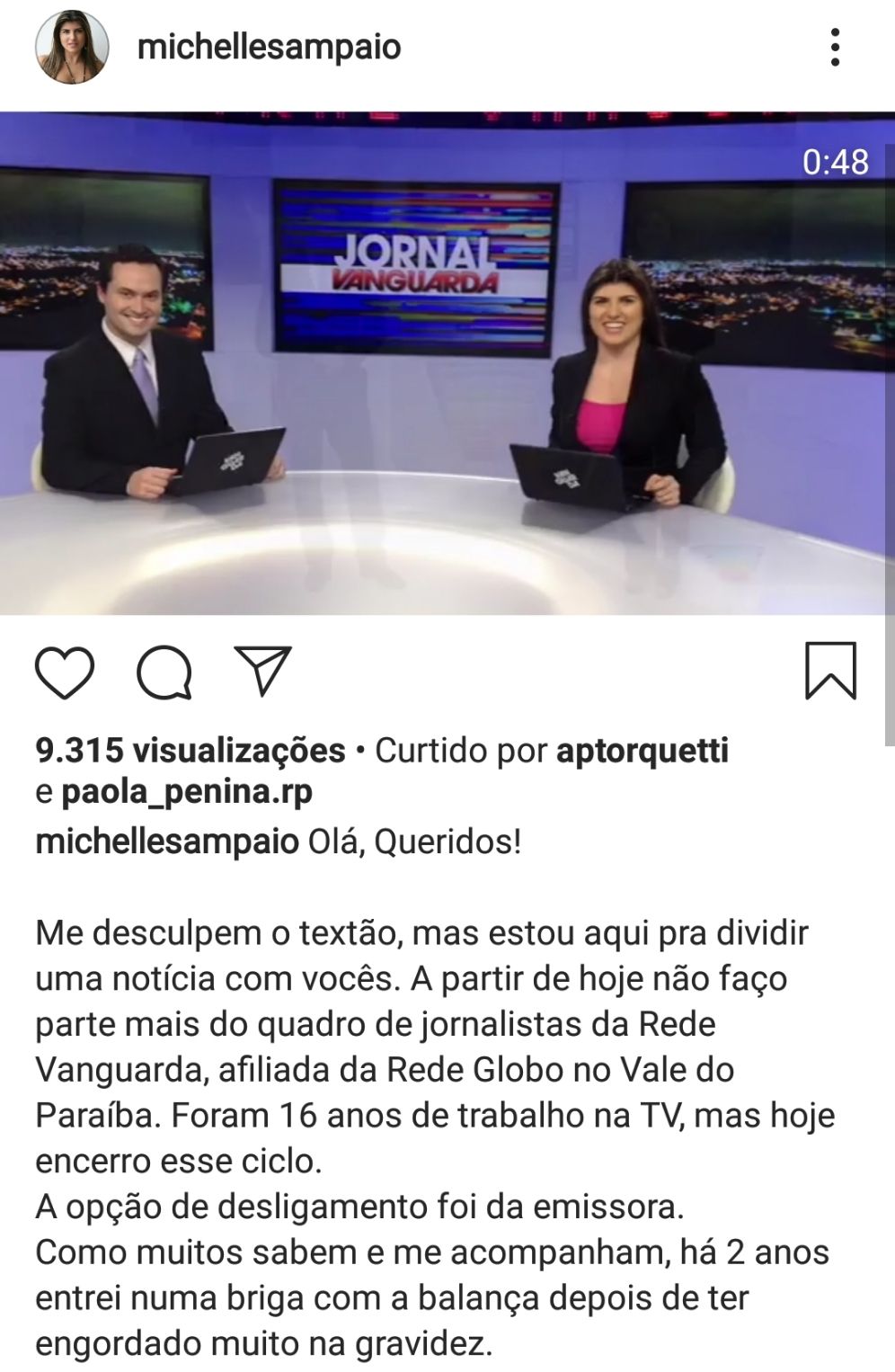 A jornalista Michelle Sampaio, que trabalhava há 16 anos na Rede Vanguarda, afiliada da Rede Globo no Vale do Paraíba, foi demitida da emissora. Ela se pronunciou na manhã deste sábado através de um texto nas redes sociais acompanhado de um vídeo que mostra inúmeros momentos ao lado de entrevistados e colegas de profissão. "Foram 16 anos de trabalho, mas hoje encerro esse ciclo. A opção de desligamento foi da emissora. Como muitos sabem e me acompanham, há dois anos entrei numa briga com a balança depois de ter engordado muito na gravidez". A ex-apresentadora do Link Vanguarda continua: "Nesses últimos dois anos, por estar acima do peso, fiquei um bom tempo trabalhando nos bastidores, cheguei a emagrecer um pouco, voltar a reportagem e a apresentação do jornal, mas sai do "vídeo" porque nunca de fato voltei ao peso antes da gravidez, que foi o pedido da emissora" , conta a jornalista.