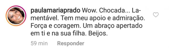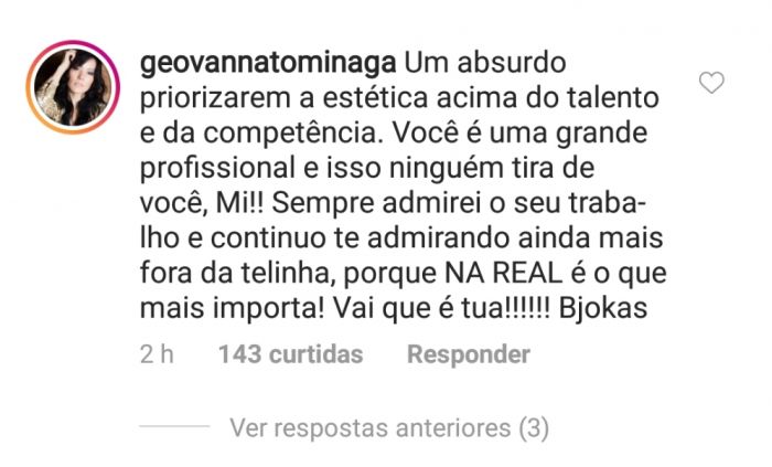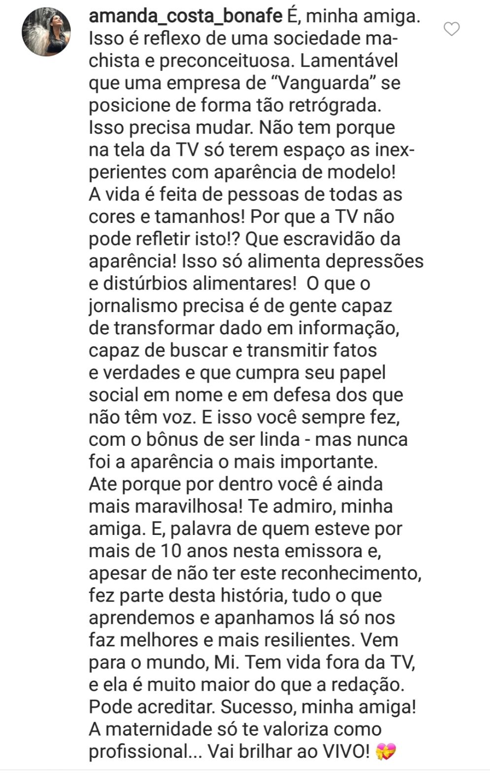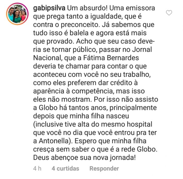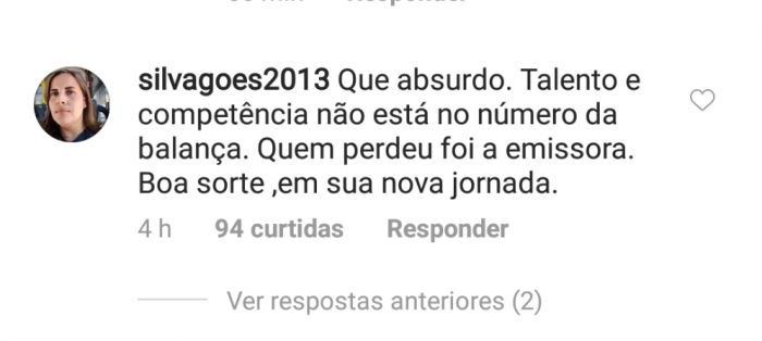 Até o momento o post feito no Instagram teve mais de 10 mil visualizações e quase 900 comentários de seguidores lamentando e desejando boa sorte. "Wow...chocada. Tem meu apoio e admiração. Força e coragem", disse Paula Maria Prado, jornalista do jornal O Vale. "Que absurdo. Talento e competência não está no número da balança. Quem perdeu foi a emissora", disse uma seguidora. Já a ex-apresentadora do Vídeo Show, que passou também pela Rede Vanguarda, Geovana Tominaga, não deixou de mandar sua mensagem. "Um absurdo priorizarem a estética acima do talento e competência. Você é uma grande profissional e isso ninguém tira de você".