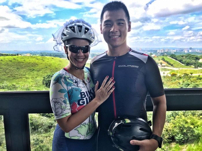 O casal Wilson Chan e Cristina Sales fizeram um passeio de bike pelo bairro Alphaville, em São José dos Campos, como estão acostumados a fazer. Mas no último domingo (17), o caminho era o mesmo, entretanto, ao longo do trajeto, foram colocadas placas com frases que indicavam o passo a passo de um relacionamento. No final do caminho , a última placa indicava que seria um pedido de casamento.