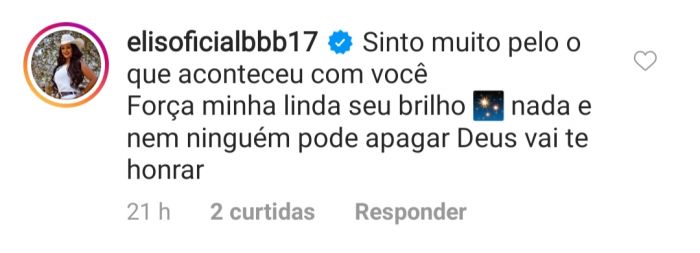 Nas redes sociais, a influencer teve apoio de seguires, entre eles, a ex-BBB Elis Nair. "Sinto muito pelo que aconteceu com você. Força minha linda (...)", escreveu.