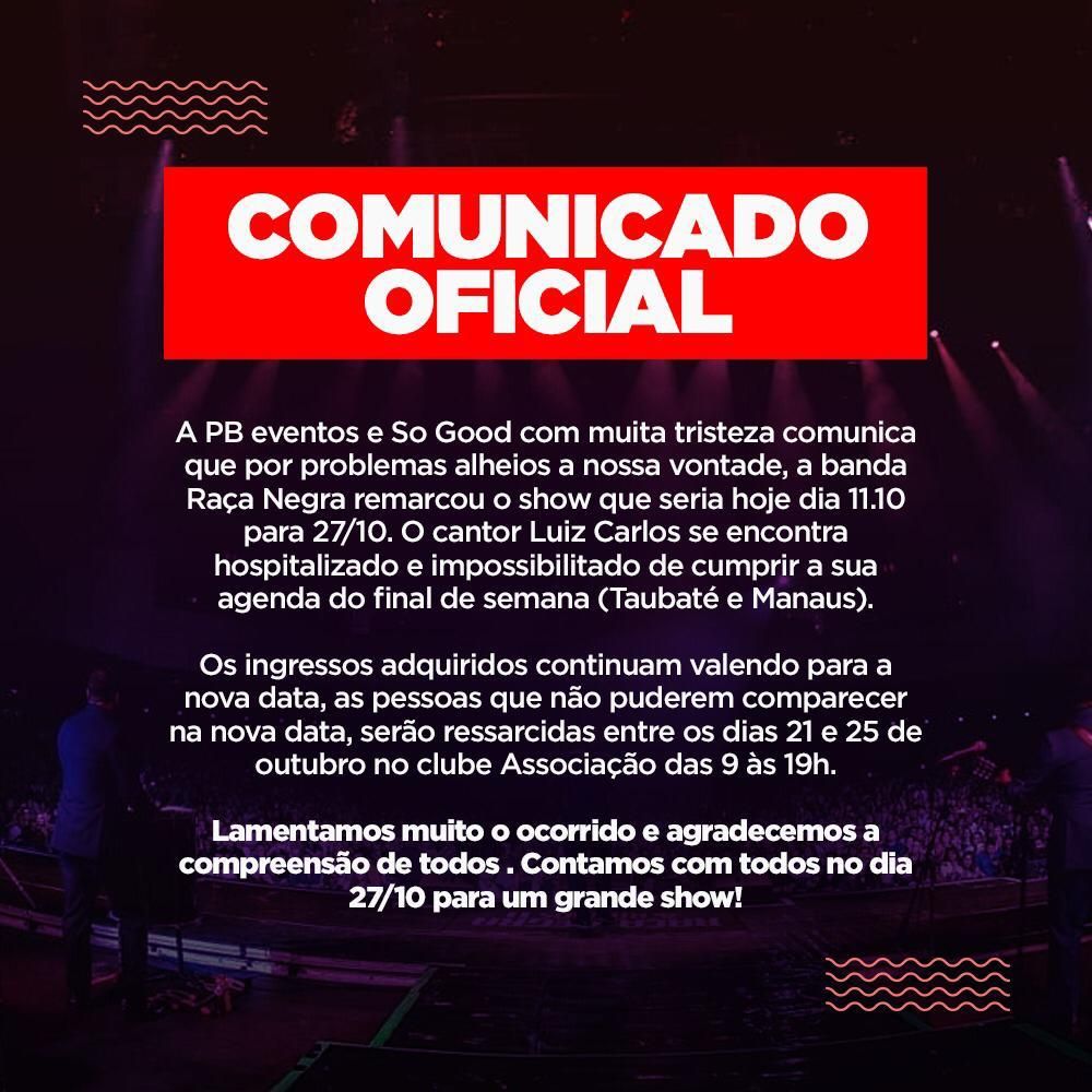 A banda Raça Negracancelou um show que faria na noite desta sexta-feira, 11, na Associação de Taubaté. A produção local divulgou que o vocalista da banda, Luiz Carlos "se encontra hospitalizado e impossibilitado de cumprir sua agenda do fim de semana (Taubaté e Manaus).