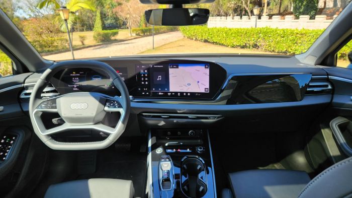 O interior segue o conceito da Audi centrado no condutor. O painel combina o Audi Virtual Cockpit de 11,9 polegadas com o display panorâmico curvo de 14,5 polegadas, equipado com tecnologia OLED. A operação dos comandos foi atualizada, enquanto o sistema de luz ambiente permite 30 opções configuráveis. O ar-condicionado automático de três zonas e os bancos dianteiros com ajustes elétricos e memória para o motorista complementam a cabine.