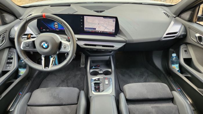 No interior, o modelo traz o BMW Curved Display, que integra painel de instrumentos de 10,25 polegadas e central multimídia de 10,7 polegadas. O sistema opera com o BMW Operating System e reúne funções de navegação, conectividade e controle do veículo. O ambiente inclui bancos com maior apoio lateral, volante com aletas para trocas de marcha e acabamentos com iluminação configurável.