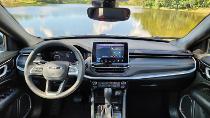 A linha Compass 2026 é formada pelas versões Sport T270, Longitude T270, Série S T270 e Blackhawk. A Sport inclui novos recursos de personalização, como os pacotes Exclusive, Tech e Premium, oferecendo itens como bancos de couro, painel digital, teto solar e condução semiautônoma. A Longitude amplia a oferta de conectividade com central multimídia compatível com espelhamento sem fio e GPS integrado. A Série S, que foi a versão que avaliei, reúne equipamentos que priorizam conveniência, como bancos elétricos dianteiros, porta-malas com abertura por sensor, teto panorâmico, rodas de 19 polegadas e recursos de assistência como monitoramento de ponto cego e Park Assist. Já a Blackhawk, equipada com o motor Hurricane 2.0, tração 4x4 e seletores de terreno, ocupa o topo da linha com foco em desempenho e capacidade.