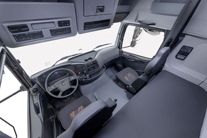 O modelo foi atualizado com foco em ergonomia, segurança e conectividade. A cabina agora possui suspensão pneumática de série, com duas configurações: Leito Teto Alto e Leito Teto Baixo. Entre os destaques estão volante multifuncional, painel digital de 12,7 cm com sistema EcoSupport, partida por botão, chave inteligente e banco pneumático com 11 regulagens.