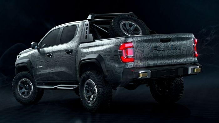 Na traseira, o destaque é o estepe aparente fixado em um Rambar exclusivo, que também abriga luzes de LED de longo alcance. Lanternas traseiras em LED, emblema Ram na tampa e para-choque com ganchos de reboque completam o conjunto. O modelo recebeu pintura especial com grafismos que simbolizam força e resistência.
