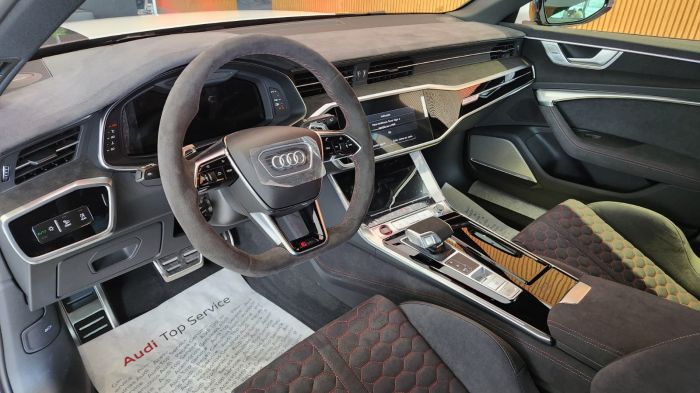 O interior possui acabamento preto com costuras vermelhas e cobre, bancos tipo concha RS e identificação "RS 6 GT" no console e nos tapetes. O sistema de som é um Bang & Olufsen Advanced 3D com potência de 1820W. O veículo traz diferencial esportivo quattro ajustado para maior desempenho, suspensão Dynamic Ride Control e pneus Continental Sport Contact 7, que reduzem a distância de frenagem de 100 a 0 km/h em dois metros.