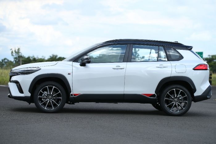 Na carroceria, versão ganha spoiler traseiro característico, pintura exterior bicolor em branco-pérola e teto, colunas e retrovisores em preto metálico. Nas portas, detalhe para as listras adesivadas em cores brancas, pretas ou vermelhas - opção de acordo com a cor do veículo. O Corolla Cross GR-Sport é identificado, ainda, pelos emblemas GR na tampa do porta-malas e na lateral.