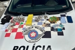 Suspeitos tentaram fugir, mas foram abordados com mais de 1,3 kg de drogas, dinheiro e balança de precisão.