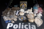 Foram apreendidos 500 gramas de maconha, uma espingarda, aves da fauna silvestre, material explosivo para recarda de munições utilizadas para caça, uma motocicleta, petrechos de caça, vidros de palmito e um Tatu abatido