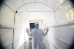 No Hospital Municipal de São José dos Campos, ao entrar no túnel, os profissionais recebem spray de desinfectantes inodoros por toda a paramentação
