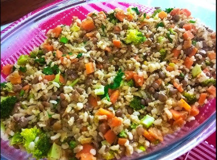 2. Almoço: Lentilha com arroz integral e legumes, fonte de proteína vegetal e fibras