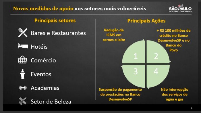 O Governo de São Paulo apresentou nesta quarta-feira (17) um plano de apoio econômico, fiscal e tarifário a bares, restaurantes, academias, salões de beleza e produção de eventos em todo o estado de São Paulo. O pacote prioriza estabelecimentos com faturamento mensal de até R$ 30 mil e prevê novas linhas estaduais de crédito, suspensão de tarifas de abastecimento e retomada de incentivos fiscais sobre leite e carne.