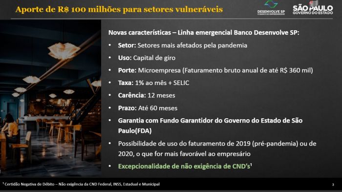 Com o novo anúncio, micro e pequenas empresas dos segmentos dos setores mais afetados terão uma linha especial de financiamento via Desenvolve SP no valor de R$ 50 milhões, com prazo de pagamento de 60 meses, oito meses de carência e taxa de juros de 1% ao mês mais Selic, além da dispensa de Certidão Negativa de Débitos.
