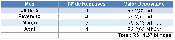 Em todo o mês de maio, a estimativa é transferir às prefeituras o valor de R$ 2,6 bilhões em repasses de ICMS. Os depósitos semanais são realizados sempre até o segundo dia útil de cada semana, conforme prevê a Lei Complementar nº 63, de 11/01/1990.