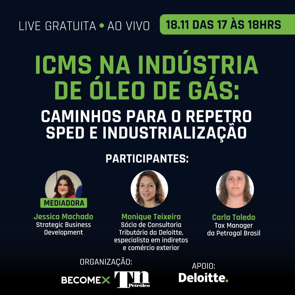 A live "ICMS na indústria de Óleo e Gás: caminhos para o Repetro SPED e Industrialização" contará com a participação da Carla Obadia Toledo, Tax Manager da Petrogal Brasil, Monique Teixeira, Sócia de Consultoria Tributária da Deloitte, especialista em indiretos e comércio exterior. Como moderadora, a live terá Jessica Machado, Strategic Business Development da Becomex.