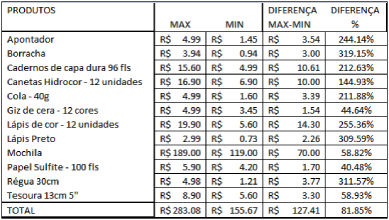 Constatou-se que em três itens da lista, a variação ultrapassou os 300% quando comparados os preços maiores e menores encontrados nas papelarias. Por exemplo, os itens Lápis Preto, Régua 30 cm e Borracha apresentaram variações de 309,59%, 311,57% e 319,15%, respectivamente.
