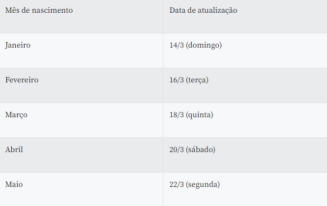 O calendário de atualização seguirá um cronograma de escala, conforme o mês de nascimento dos clientes. O cronograma começou no último domingo (14) para os nascidos em janeiro e encerrará em 31 de março, para os nascidos em dezembro.