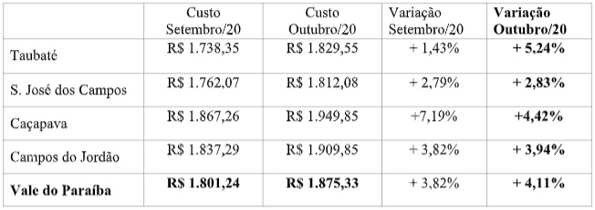 O Núcleo de Pesquisas Econômico-Sociais da Universidade de Taubaté (NUPES) calculou o custo da cesta básica familiar, nos municípios de Caçapava, Campos do Jordão, São José dos Campos e Taubaté e divulgou, hoje (10), a variação dos preços no Vale do Paraíba. Em outubro o valor da cesta foi R$ 1.875,33.
