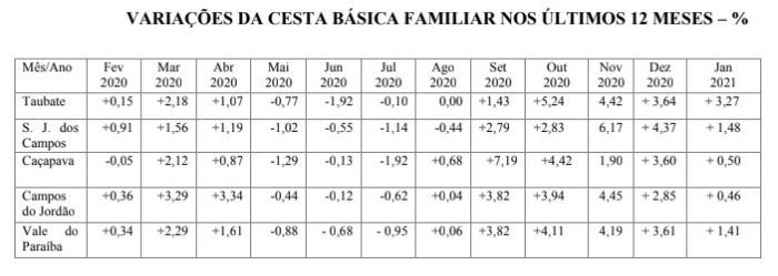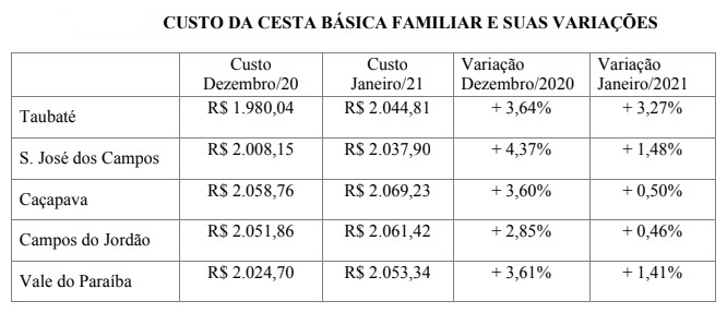 O NUPES calculou o custo da cesta básica recomendada acima, nos municípios de Caçapava, Campos do Jordão, São José dos Campos e Taubaté e representa como a variação dos preços da cesta básica do Vale do Paraíba. Em janeiro de 2021 o valor da cesta básica foi R$ 2.053,34 sendo superior ao que foi verificado em dezembro de 2020 que foi de R$ 2.024,70, representando um aumento no percentual de 1,41%, um percentual positivo, porém abaixo do verificado no mês de dezembro que foi de 3,61%. Este aumento do preço da cesta básica é bem superior a inflação oficial de janeiro de 2021 medido pelo (IPCA-15 do IBGE) que foi de 0,59%, indicando uma inflação mais suave para o primeiro mês do ano, comparativamente aos últimos quatro meses.