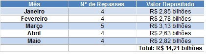 Com os depósitos efetuados nesta terça, o valor acumulado distribuído às prefeituras em junho sobe para R$ 2,60 bilhões. Os depósitos semanais são realizados sempre até o segundo dia útil de cada semana, conforme prevê a Lei Complementar nº 63, de 11/01/1990. Nos primeiros cinco meses de 2021, a Secretaria da Fazenda e Planejamento depositou R$ 14,21 bilhões aos municípios paulistas.