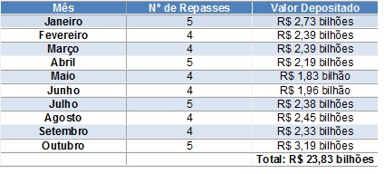 O depósito feito pela Secretaria da Fazenda e Planejamento é referente ao montante arrecadado no período de 3 a 6 de novembro. No mês de outubro, a estimativa é transferir às prefeituras o total de R$ 2,86 bilhões em repasses de ICMS.