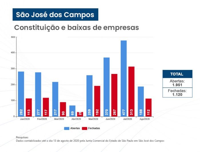 Os números constam de balanço divulgado esta semana pela Associação Comercial e Industrial de São José dos Campos, com base em números registrados no Escritório Regional da Junta Comercial do Estado de São Paulo (Jucesp). O saldo positivo de 831 empresas é significativo por ter sido registrado durante o período mais grave da crise gerada pela pandemia do novo coronavírus.