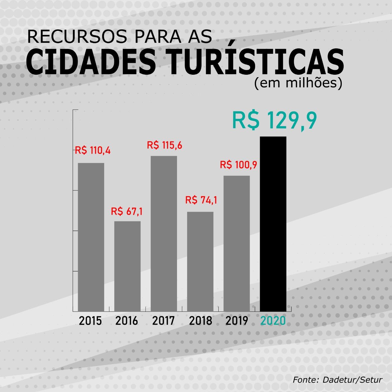 Nos oito primeiros meses de 2020 os repasses de recursos para as obras e infraestrutura turística nas estâncias e municípios de interesse turístico (MITs) chegaram ao maior valor dos últimos seis anos: R$ 129,9 milhões. Foram atendidas mais de 150 cidades, por meio do Departamento de Apoio ao Desenvolvimento dos Municípios Turísticos - Dadetur - da Secretaria de Turismo do Estado. O valor é 28,7% superior a 2019, quando foram repassados R$ 100,9 milhões nos primeiros oito meses.