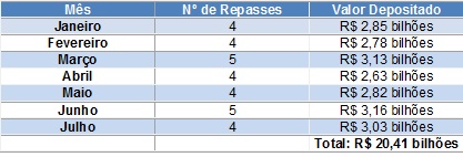 Os valores correspondem a 25% da arrecadação do imposto, que são distribuídos às cidades com base na aplicação do Índice de Participação dos Municípios (IPM) definido para cada cidade. Os municípios já haviam recebido R$ 2,47 bilhões em três repasses anteriores, realizados em 13, 20 e 27 de julho, relativos às arrecadações dos períodos de 5/7 a 8/7, de 12/7 a 16/7 e de 19/7 a 23/7, respectivamente.