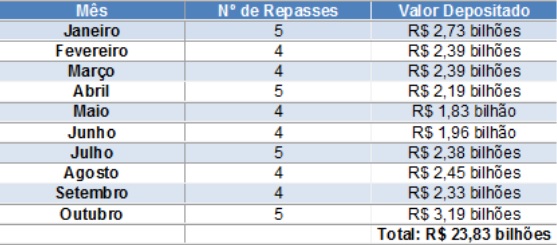 Os municípios já haviam recebido R$ 557,08 milhões no repasse anterior, realizado em 10/11, relativo à arrecadação do período de 3/11 a 6/11. Com os depósitos efetuados hoje, o valor acumulado distribuído às prefeituras em novembro sobe para R$ 946,25 milhões.