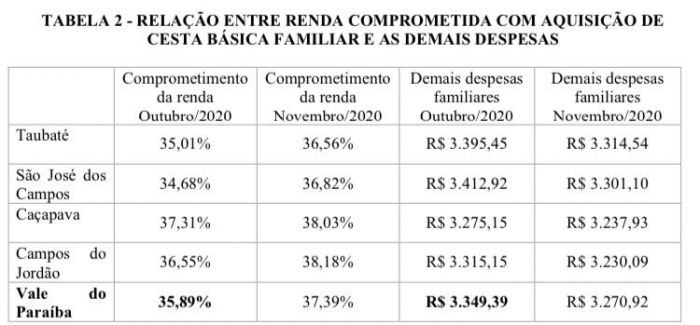 A Tabela 2 apresenta o comprometimento dos cinco salários mínimos na aquisição da cesta básica familiar, nas cidades pesquisadas e a média do Vale do Paraíba, bem como a disponibilidade financeira para outras despesas. O percentual da renda necessária à compra da cesta em novembro foi em média 37,39% da renda total, portanto, um pouco superior aos 35,89% do mês de outubro de 2020. Este aumento nos preços da cesta básica leva a uma perda (decréscimo) de -2,35% nas disponibilidades para outras despesas, significando uma maior restrição dos consumidores de baixa renda aos produtos essenciais ao seu bem estar.