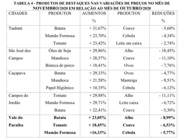 Na comparação dos preços médios de novembro de 2020 em relação outubro de 2020, dos 32 produtos de alimentação pesquisados, 20 apresentaram aumentos e 12 reduções. Dos 5 produtos do item higiene pessoal 4 apresentaram aumento e 1 reduções. Em relação aos 7 produtos de limpeza doméstica 5 apresentaram aumentos e 2 reduções.