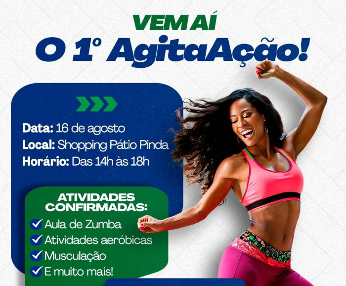 O Shopping Pátio Pinda, em parceria com a Clínica RESEC, realiza neste sábado (16) o AgitAção, evento voltado à promoção da saúde e do bem-estar da população. A iniciativa acontecerá das 14h às 18h, na Portaria 2, oferecendo aulas gratuitas de diversas modalidades, como musculação, Zumba, FitDance, Muay Thai e Treinamento Funcional.