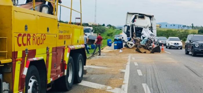 Uma colisão traseira entre duas carretas interditou parcialmente a faixa da direita da Rodovia Presidente Dutra, no sentido sul, em Pindamonhangaba. O acidente ocorreu na BR-116, km 92, por volta das 9h55 de hoje, sexta-feira (12).