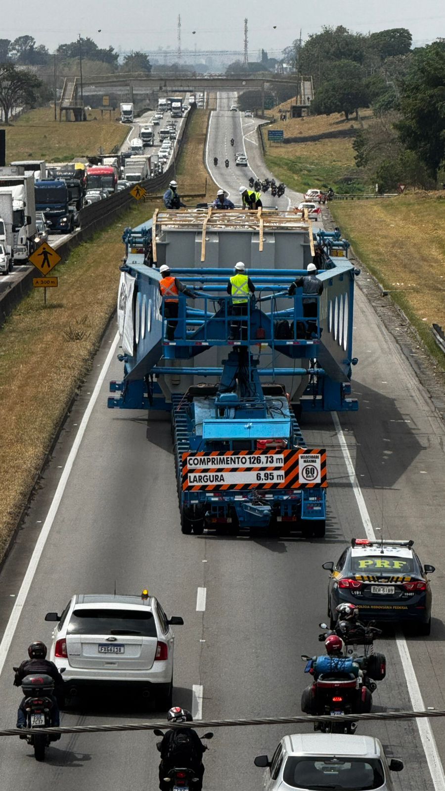 De acordo com a Polícia Rodoviária Federal (PRF), a carreta ocupa até duas faixas da pista durante o deslocamento, o que exige atenção redobrada dos motoristas que passam pelo local.