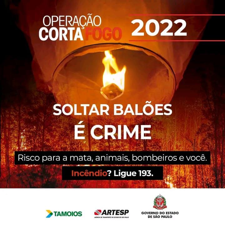 A Concessionária Tamoios solicita aos usuários que não joguem qualquer objeto na rodovia, principalmente bitucas de cigarro, fósforos ou qualquer material inflamável e não queimem lixo. Além disso, lembra que soltar balões é crime.