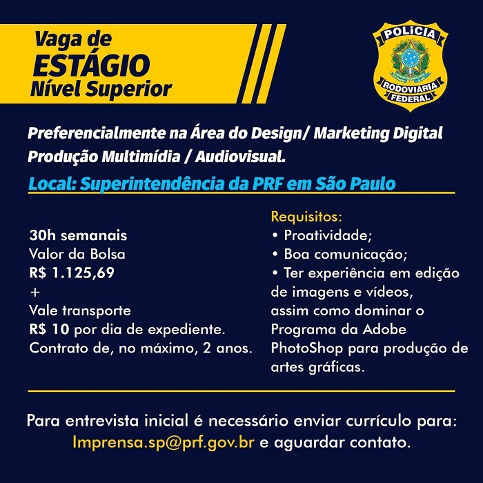 O local de trabalho é na Superintendência da Polícia Rodoviária Federal (PRF) em São Paulo. A carga horária é de 30h semanais com bolsa no valor de 1.125,69, mais benefícios.