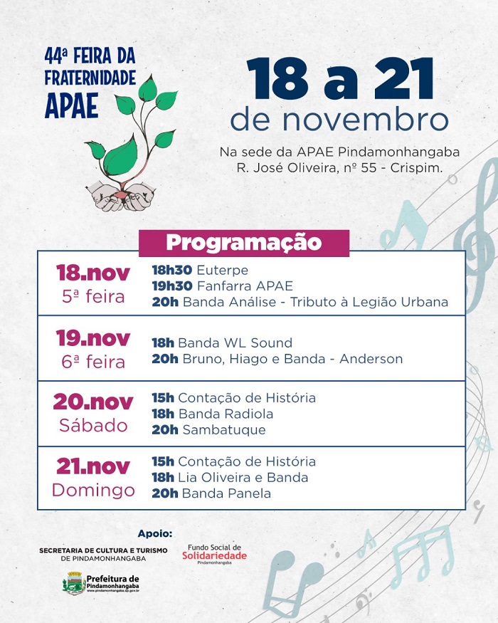 Entre os dias 18 e 21 de novembro vai ocorrer a 44ª Feira de Fraternidade APAE. Evento é organizado pela APAE e conta com o apoio da Prefeitura de Pindamonhangaba e do Fundo Social de Solidariedade.