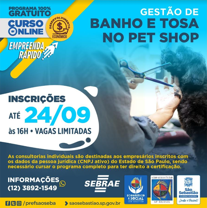 A Prefeitura de São Sebastião, por meio da Secretaria de Desenvolvimento Econômico e Social (SEDES), abriu as inscrições para o programa gratuito de "Gestão de banho e tosa no Pet Shop".