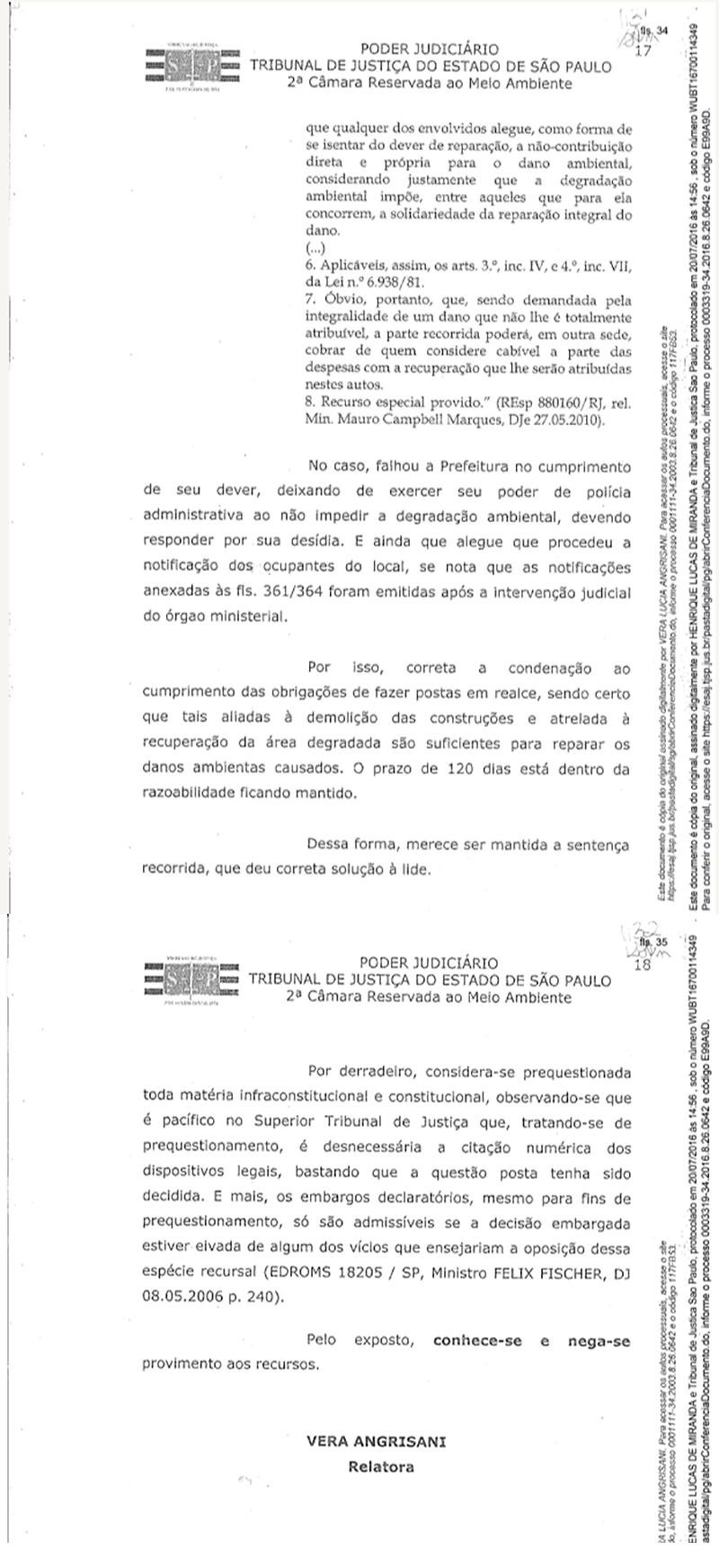 Houve recurso e o Tribunal de Justiça de São Paulo, que manteve a sentença integralmente. A sentença transitou em julgado em 23/10/2015 e em julho/2016, o Ministério Público do Estado de São Paulo iniciou a fase de cumprimento da sentença . Os réus também foram condenados a indenizar pelos danos ambientais causados pelas suas atividades irregulares.