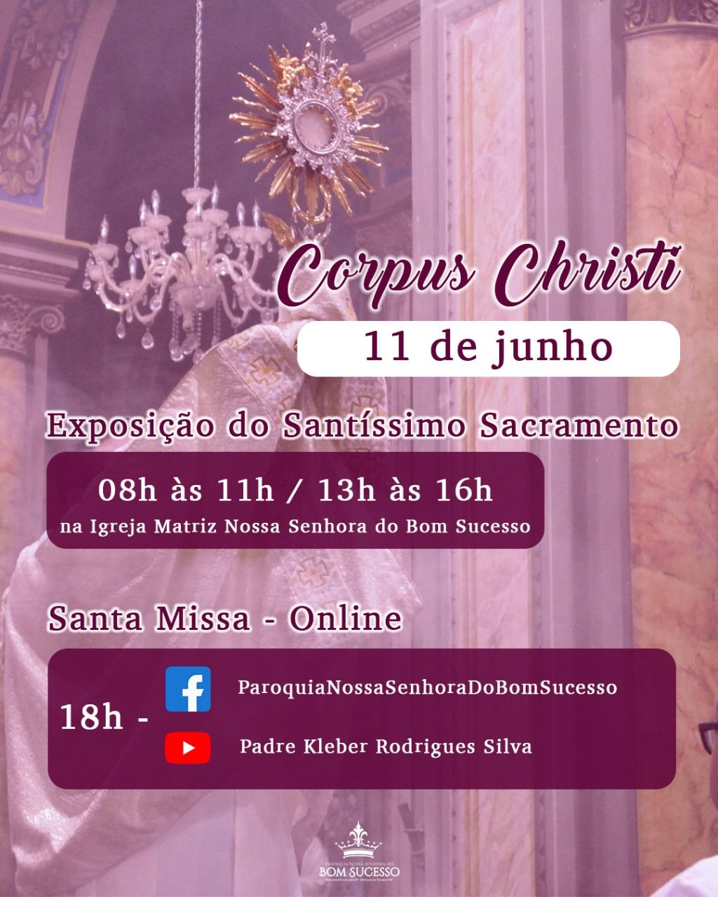 A Paróquia Nossa Senhora do Bom Sucesso, celebra a Solenidade do Santíssimo Corpo e Sangue de Jesus Cristo, o Corpus Christi, na próxima quinta-feira (11).