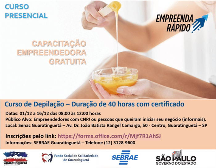 E o terceiro curso oferecido é de depilação. O público alvo são empreendedores ou pessoas que queiram iniciar seu negócio. A carga horária é de 40h e é dado um certificado para os participantes, ao fim do curso.