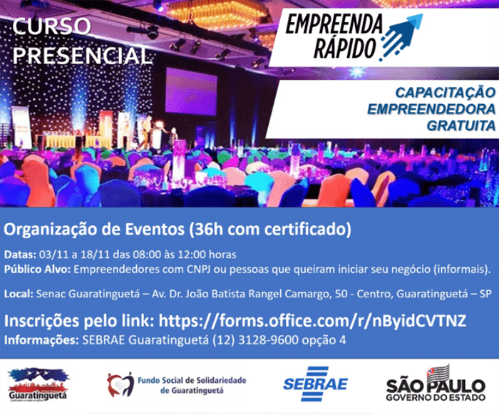 Outro curso oferecido em parceria com o Sebrae, é de noções básicas para organização de eventos. As aulas são presenciais e gratuitas.