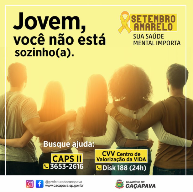 A Secretaria de Saúde/ RAPS (Rede de Atenção Psicossocial) da Prefeitura de Caçapava, está lançando a campanha Setembro Amarelo - de conscientização e prevenção ao suicídio.