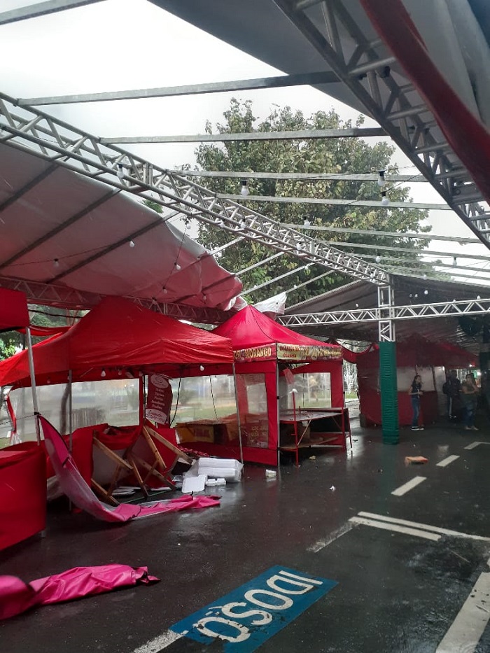 Na tarde deste domingo (5), um temporal atingiu a cidade de Pindamonhangaba. A chuva forte causou danos nas estruturas de celebração das festividades natalinas.
