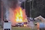 Veículo foi completamente consumido pelas chamas; duas pessoas ficaram feridas